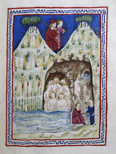 Scene from Pierre d’Eboli, De Balneis Puteolanis (Before 1494). Valencia, Biblioteca Històrica, MS. 838 f°4v, Wikimedia Commons.